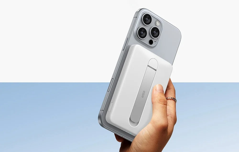 ESR Qi2 MagSlim 5000 mAh magnetische powerbank met standaard (wit).